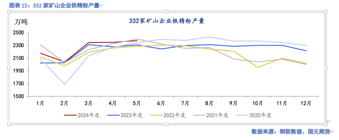 今年以来国产矿生产维持高位,根据钢联数据显示,1-5月332家矿山企业铁精粉累计产量1.13亿吨,同比增加3.67%。目前国产矿产业集中度有所提高,设备更新加快,生产节奏受环保、重大会议影响变小。