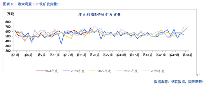 自财年开始月(2023.07)截至6月14日,BHP发运量为27517.3万吨,发运进度为97.58%。发运趋势前低后高,节奏维持常态,基本能够完成发运目标下限。