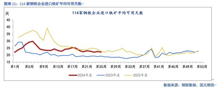 上半年,钢厂库存依然维持低库存周转状态,114家样本钢厂库存可用天数大概维持在24天,较去年同期增加3天。从黑色产业来看,地产仍处于底部调整中,钢厂处于微利中,对炉料库存仍会维持低库存状态。