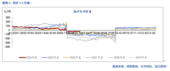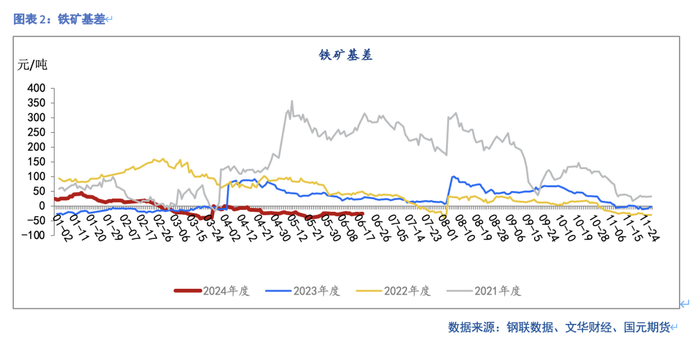 从铁矿主力合约基差来看,年初以来铁矿基差波动幅度较往年有所收窄,波动范围(-50)-50 元/吨,而往年同期基差波幅能达到 -40-100元的区间。今年“金三银四”旺季阶段基差的回升幅度比较低,反映出旺季现货市场需求疲弱,带动价格抬升乏力。同时,在第二阶段期货上涨趋势阶段,现货涨幅不及期货,基差逐步走缩,反映出期货对价格有一定领先性。