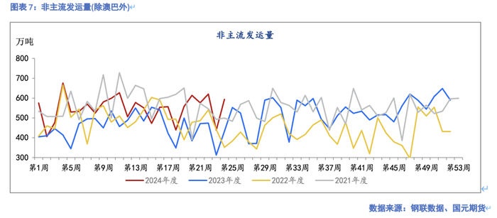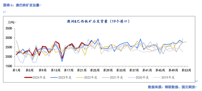 截至6月14日,全球周均发运量为2980万吨,同比增加130万吨。其中澳矿周均发运在1768.5万吨,同比下降11.1万吨;巴西矿山周均发运在663.34万吨,同比增加46.98万吨;非主流周均发运量548.2万吨,同比增加94.4万吨。总体看,全球发运量呈现前低后高趋势,总量较去年同期高出3120万吨,增量主要体现在非主流发运和巴西发运。