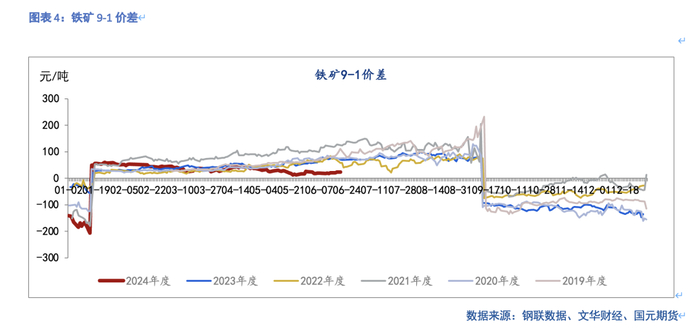 月间价差方面,上半年矿价近强远弱,但是价差幅度较往年有明显收缩。05-09 价差一路从82不断缩小至21附近;09-01 价差从 5 月初的 31缩小至15。总体看来矿石近月供应宽松,供需矛盾并不突出,导致今年近远月价差幅度收缩。尤其是今年一季度钢厂减产幅度较大,市场对远月需求预期改善,5-9价差出现回落,与去年走势背离。