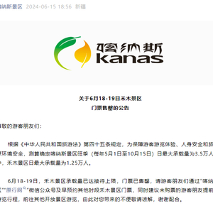 6月15日古尔邦节第一天,位于阿勒泰的禾木景区发布通知称,该景区日最大承载量为1.25万人,6月18-19日景区承载量达接待上限,门票售罄。