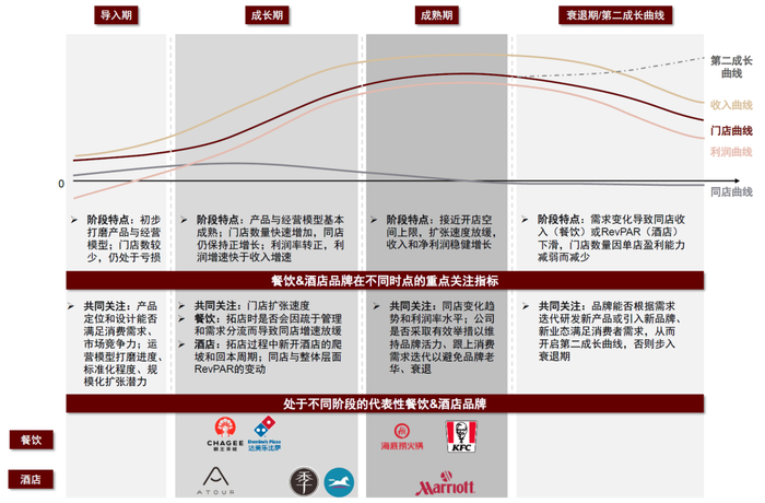 我们认为多数服务品牌均会经历生命周期的不同阶段,不同阶段的投资逻辑和关注重点有所差异。考虑到需求侧市场空间的天花板、消费者偏好的持续迭代演变、及供给侧企业管理能力的边界,我们认为大多数服务品牌会经历生命周期的不同阶段。我们以餐饮和酒店品牌为例,将其生命周期大致划分为导入期、成长期、成熟期、衰退期/第二成长曲线四大阶段,我们认为不同阶段或存在不同的投资逻辑与重点关注指标。