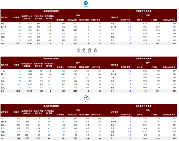 注:各品牌同价格带酒店根据城市线级略有不同:汉庭具体参考一线、新一线城市200-450元;二线城市130-300元;三线城市130-250元;四线城市100-210元;五线城市100-200元;全季具体参考一线城市300-550元,新一线城市250-500元,二线城市200-400元,三线城市200-300元,四线、五线城市150-230元;亚朵具体参考一线城市500-750元,新一线城市250-650元,二线城市300-500元,三线城市300-450元,四线、五线城市为250-400元