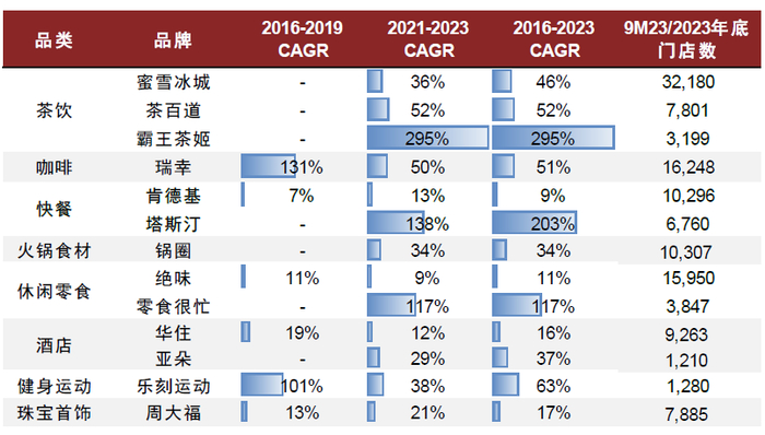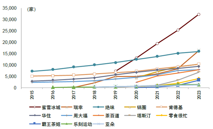注:1)蜜雪冰城为中国蜜雪和幸运咖品牌门店数,华住为中国大陆在营门店数,肯德基为中国大陆地区门店数,周大福为中国大陆地区周大福品牌门店数;2)乐刻运动、塔斯汀、霸王茶姬门店数参考极海大数据及窄门餐眼,零食很忙门店数量为每月门店评分公示中各等级门店数量加总,其余来自公司公告;3)蜜雪冰城、塔斯汀自2019年开始计算,茶百道、霸王茶姬自2020年开始计算,乐刻运动自2016年开始计算,瑞幸咖啡自2018年开始计算,亚朵自2018年开始计算;4)除蜜雪冰城采用9M23门店数以外,其余均采用2023年底门店数