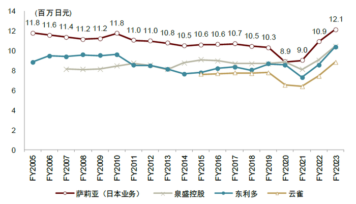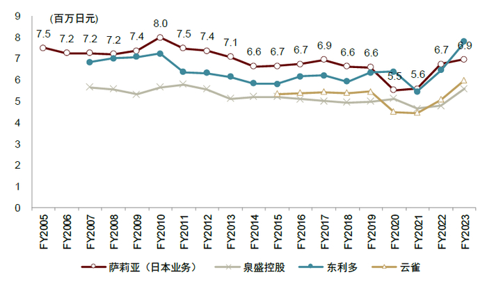 注:萨莉亚为日本业务数据,其他公司为整体数据;萨莉亚财年截至每年8月底,泉盛控股、东利多财年截至每年3月底,云雀财年截至每年12月底