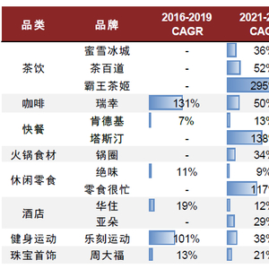 ► 霸王茶姬:专注原叶鲜奶茶,品牌势能塑造能力突出;供应链和运营能力支撑门店快速扩张。霸王茶姬成立于2017年,专注于原叶鲜奶茶,持续强化品牌势能塑造(如定位国风茶饮占领消费者认知,迭代品牌logo和视觉形象,推出热量计算器迎合消费者对健康诉求,大力投入品牌营销,通过全国范围内迅速拓店和在核心商圈开设旗舰店以提升品牌曝光),截至2024/5/20霸王茶姬全球注册会员数已达1.3亿[7]。此外,原叶鲜奶茶的大单品策略及供应链和运营能力的持续提升支撑门店快速扩张,并通过高质量且始终如一的产品力和运营水平保障品牌势能的持续巩固。供应链方面,霸王茶姬重点布局茶叶供应链;门店运营方面,新一代自动化制茶设备有效提升出杯效率和标准化程度(口味误差率缩小到千分之2,平均出餐效率提升至8秒/杯7)。公司预计2024年GMV超200亿元(2023年GMV达108亿元)[7]。