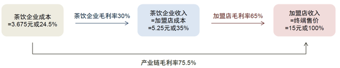 以茶饮为例拆解其价值链,假设一杯15元的茶饮,加盟店毛利率65%,茶饮品牌企业供货毛利率30%,则两个环节加总的产业链毛利率可达75.5%,在并不算很高的终端售价基础上能够使两个环节的参与者实现较为可观的利润率水平。