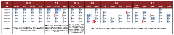 ► 在美国消费市场,服务品牌是产品品牌趋于成熟后的下一风口。美国消费行业产品品牌取得较高增长和股价回报的阶段多处于2000年之前:食品饮料行业1950年前规模扩张,1950-1970年期间海外拓张成为新刺激点;零售业龙头1970-2000年整合线下渠道资源,利用规模优势与品控打造大商超综合体快速发展;美妆个护行业头部多为1960年及以后创立,享受全球化红利依靠品牌力强势出海。2000年以后产品业态受制于需求变化与供给饱和,多进入平稳增长阶段;而基础温饱与实物消费欲望满足后,精神与体验需求带动服务业自2000年以后明显升温,餐饮、酒店、旅游行业出现更多上市公司及创造更高股价回报。