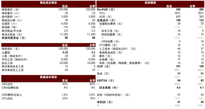 注:全季渠道成本假设中的CRS费用/总收入以CRS占比*CRS收费标准计算为4.8%,超出全季规定的CRS收费/总收入上限为 3.5%,因此我们假设其为3.5%