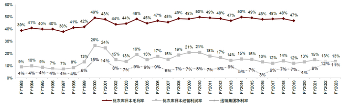 图表:优衣库日本毛利率和经营利润率,以及迅销集团净利率