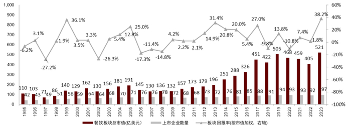 ► 在日本餐饮市场,板块市值扩容同样印证了可以带来可观投资回报。自1990s经济泡沫破灭后,日本餐饮门店从大型综合化走向细分化发展阶段,餐饮板块总市值由1995年的约110亿美元增长至2023年的约521亿美元,这一方面来自于上市企业数量的增加(由1995年的42家翻倍增长至2023年的97家),另一方面更关键的是来自于在二级市场上能享受到的投资回报红利,日本餐饮板块1996-2023年回报率CAGR约为4.4%(对比日经225指数同期回报率CAGR约为1.9%)。