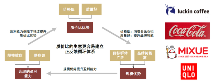► 质价比的生意更易形成正循环。质价比的生意客单价相对较低、较多为刚需场景,目标消费群体范围更大、更容易扩大规模。随着规模扩大,规模效应带来的原材料成本和总部费用摊薄将提升公司盈利能力,且企业有能力通过持续强化供应链建设以巩固质价比优势(维持低价的同时提升产品质量),形成规模、质价比和盈利能力的正循环。