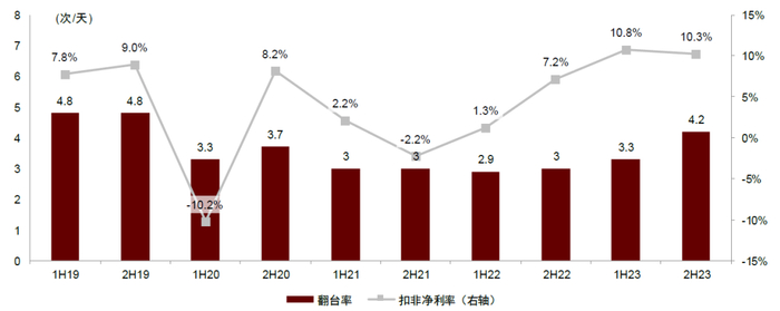 注:下半年翻台率=全年翻台率*2-上半年翻台率;2021年及以后扣非净利率剥离特海;扣非净利率为归母净利润剔除汇兑收益净额、按公允价值计入损益的金融资产产生的收益(亏损)净额、赎回长期债券产生的收益/收入
