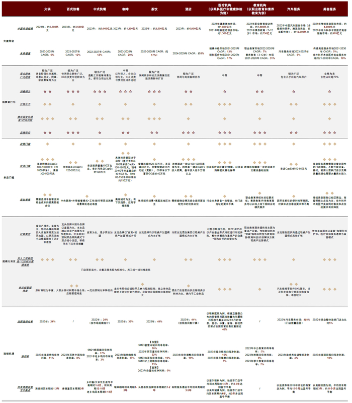 品类自身商业逻辑决定其赛道宽度,关注大空间下受众广泛、门槛较低且易成规模的优势赛道。在服务品牌连锁中,我们认为各大细分品类在具体商业逻辑层面或具备较大的差异性,而底层商业逻辑出众的品类往往可以拓宽其赛道宽度,并有望孕育出能够穿越周期的大市值公司。我们对几大服务连锁品类(火锅、西式快餐、中式快餐、咖啡、茶饮、酒店、医疗机构、教育机构、汽车服务、美容服务)详细拆解如下,并尝试从供需等视角总结框架,对比分析服务连锁业态各细分赛道发展的优劣势、龙头拓展市场空间的机会大小: