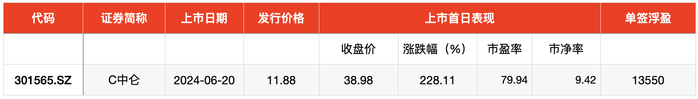 上周,中仑新材(301565.SZ)正式登陆创业板,上市首日,中仑新材开盘价为50元/股,涨幅为320.88%,截至收盘,中仑新材股价报收39.98元/股,涨幅为228.11%。按收盘价计算,投资者中一签浮盈13550元。