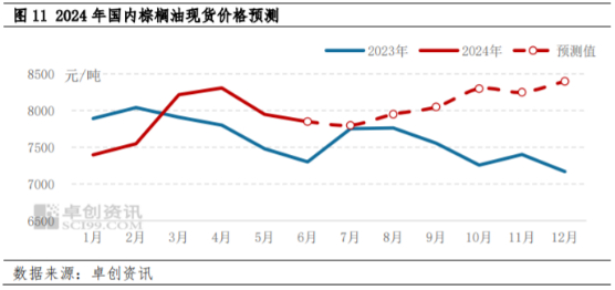 综上所述,上半年棕榈油价格先涨后跌,供应因素占据主导;下半年棕榈油市场供需双增,全球供需平衡收紧。除此之外,下半年美联储降息以及国际油价走高预期,或进一步推升棕榈油价格上涨,预计下半年棕榈油现货价格先跌后涨,重心上移,价格波动区间在7800-8400元/吨。