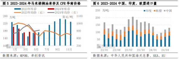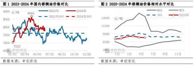 2024年上半年棕榈油现货价格先涨后跌,价格重心同比维持高位。下半年随着极端天气的扰动以及产地油棕老龄化,三季度棕榈油产量增幅或不及预期,外加美联储降息预期以及国际油价的提振,棕榈油现货价格或偏强运行,重心较上半年或有上移。