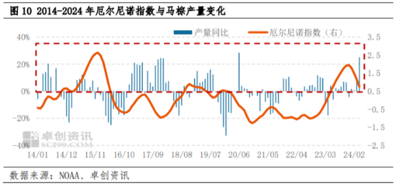 厄尔尼诺现象导致东南亚干旱少雨,一般会对全球棕榈油的产量造成负面影响。从近十年历史数据可以看出,一般厄尔尼诺现象对棕榈油产量的影响会存在6-10个月的滞后效应。三季度为棕榈油增产季,但由于2023年7月份全球进入厄尔尼诺状态,2023年11月至次年1月达到峰值,通过当时产地降雨情况来看,本次厄尔尼诺可能会抑制印度尼西亚棕榈油产量增幅。
