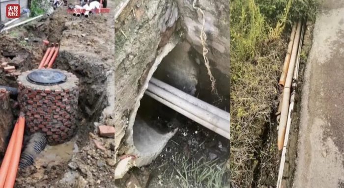 在村民的帮助下,记者打开一处污水井,拨开泥土,能看见红色强线缆与污水管赫然并排摆放在一起。按照施工规范,强弱电管和污水管必须保持相应的距离,因为一旦污水管线出现泄漏、损毁,紧挨着的强弱电管线将带来难以估量的危险。