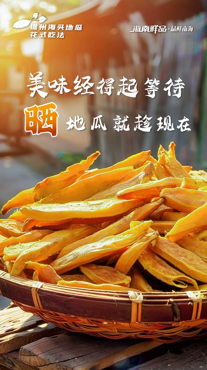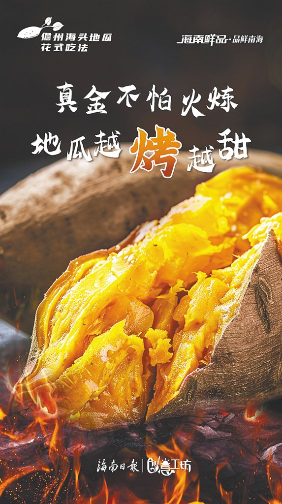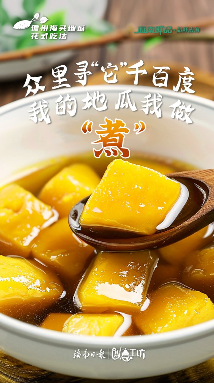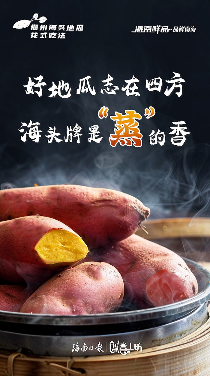 海南日报新媒体特别策划推出一组创意海报《儋州海头地瓜花式吃法》,通过蒸、煮、烤、炸、晒等关键词,用朗朗上口的文案展现海头地瓜如何一瓜多吃,趣味十足。在视觉呈现上,运用实景图+AI技术的表现手法,通过细致的色彩和创意的构图,让画面散发出美味的诱惑。