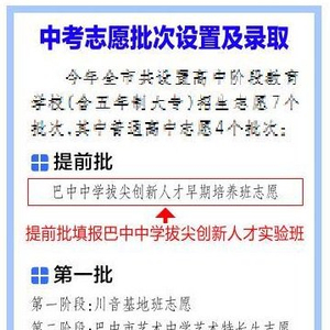 全市意愿来我校就读的初三优秀毕业生均可填报,在提前批次中自主填报“巴中中学拔尖创新人才早期培养班志愿”,完全不影响其他批次任何志愿填报。
