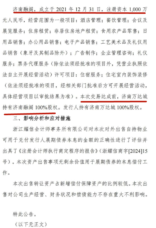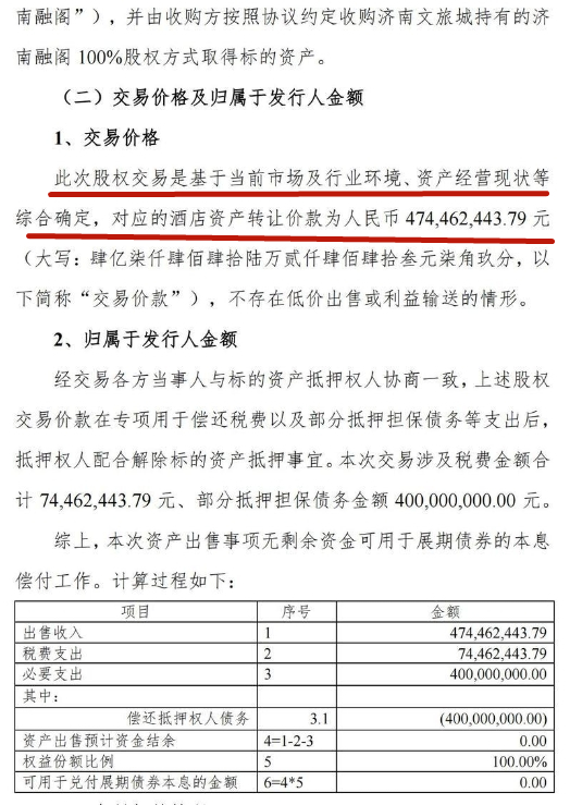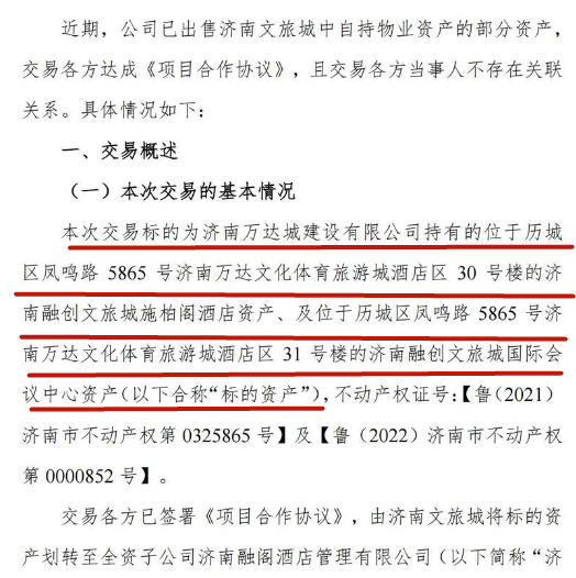 公告内容显示,该部分资产在原在济南文旅城名下,在本次交易之前被划转至全资子公司济南融阁酒店管理有限公司名下,然后再由收购方买下济南融阁100%股权。
