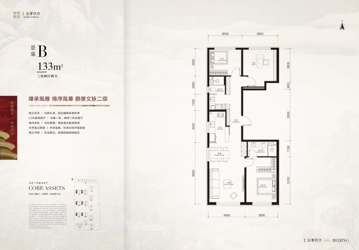 约133㎡三室两厅两卫全部是南北通透的边户,南向面宽达到4米,可以270°采光通风,一楼也不用担心遮挡。并且和洋房如出一辙,也设计了尺度诱人的餐客厨一体空间,面积也达到40余平,加上景观餐厅,随时可以呼朋唤友,来一场隆重的京城家宴。