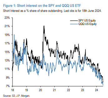 6月20日,摩根大通分析师Nikolaos Panigirtzoglou领衔的全球市场策略团队发布研报,指出美股市场上一个引人注目的现象:美国两大股指ETF的空头头寸已经降至历史新低——跟踪标普500指数的ETF SPY和跟踪纳斯达克100指数的ETF QQQ——为美股提供了稳定的上涨动力。