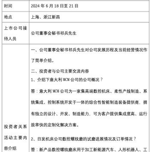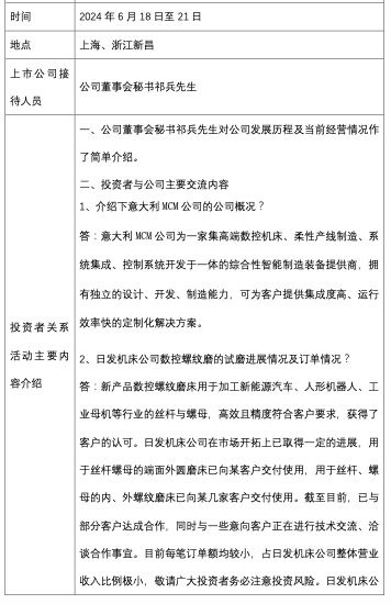 日发精机向投资者介绍了意大利MCM公司的公司概况。意大利MCM公司为一家集高端数控机床、柔性产线制造、系统集成、控制系统开发于一体的综合性智能制造装备提供商,拥有独立的设计、开发、制造能力,可为客户提供集成度高、运行效率快的定制化解决方案。