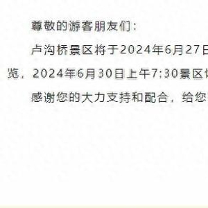 卢沟桥景区6月27日至29日临时关闭 中国新闻网 中国新闻网官方账号 2024.06.2413:46 关注 中新网6月24日电 据卢沟桥文化发展中心微信公众号消息,卢沟桥景区将于2024年6月27日-6月29日临时关闭,届时景区暂停参观游览,2024年6月30日上午7:30景区恢复开放。 公告截图