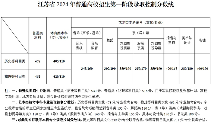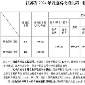 刚刚,江苏2024年高考分数线公布! 扬子晚报 《扬子晚报》官方账号 2024.06.2416:37 关注 江苏普通类本科历史等科目类分数线478分,物理等科目类分数线 462分。 来源 | 江苏省教育考试院