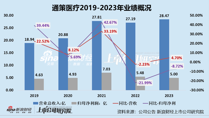 三年股价跌87%,市值蒸发超千亿,“牙茅”风采或已不在,从业绩表现中也可以看出,2022年及2023年,通策医疗要么业绩双降,要么增收不增利,其中2022年,公司营收同比下降2.23%至27.19亿元,归母净利润同比下降21.99%至5.48亿元。2023年,在去年业绩表现不理想的情况下,通策医疗增收不增利,营收同比增长4.7%至28.47亿元,归母净利润同比下降8.72%至5亿元。