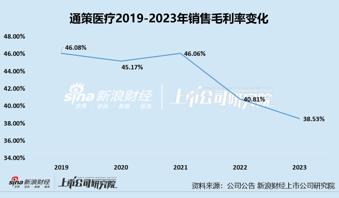 除了近两年的业绩表现难容乐观之外,2021年后,通策医疗销售毛利率和归母净利率持续下滑。其中,2021-2023年销售毛利率分别为46.06%、40.81%、38.53%,2022年、2023年分别下降5.25个百分点、2.28个百分点。