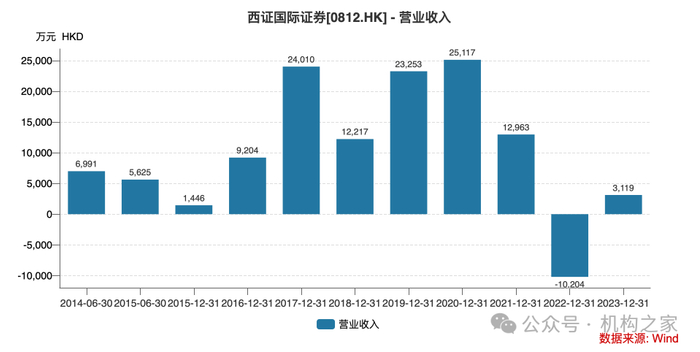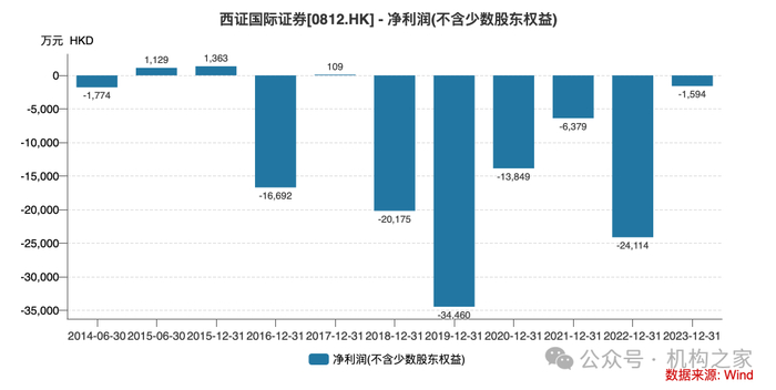 更为严峻的是,从盈利能力来看,西证国际证券的表现更是令人失望。在2015年至2023年的九年时间里,公司仅在2015年和2017年实现盈利,分别为0.1亿港元和109.2万港元。而在其他年份,公司均处于亏损状态,这九年间公司累计亏损金额超11亿港元。这种持续的巨额亏损不仅严重消耗了公司的资本,也对其他业务线的发展造成了显著影响,导致公司陷入恶性循环。