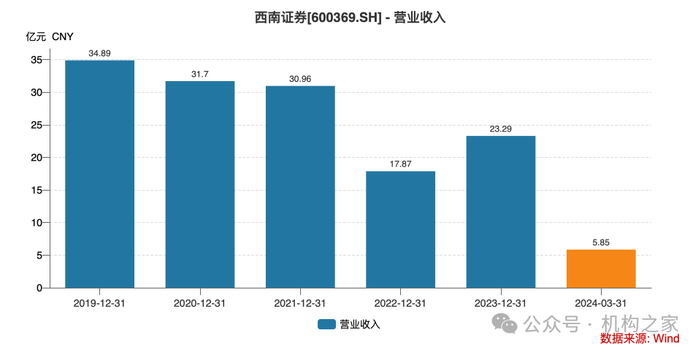 然而,近年来西南证券的经营状况不容乐观。根据Wind数据,西南证券营收持续下滑,从2019年的34.89亿元下滑到了2023年的23.29亿元,复合增长率为-7.77%。