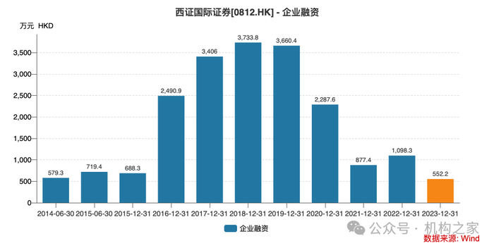 企业融资业务原本被寄予厚望,被视为西南证券国际化战略的重要支柱。在收购初期,该业务确实呈现出强劲的增长势头。从收购前2014年的仅579.3万港元收入,到2016年飙升至2500万港元,2018年更是创下3733万港元的历史新高。这种快速增长反映出西证国际证券在利用母公司背景、开拓中资企业融资业务方面初见成效。