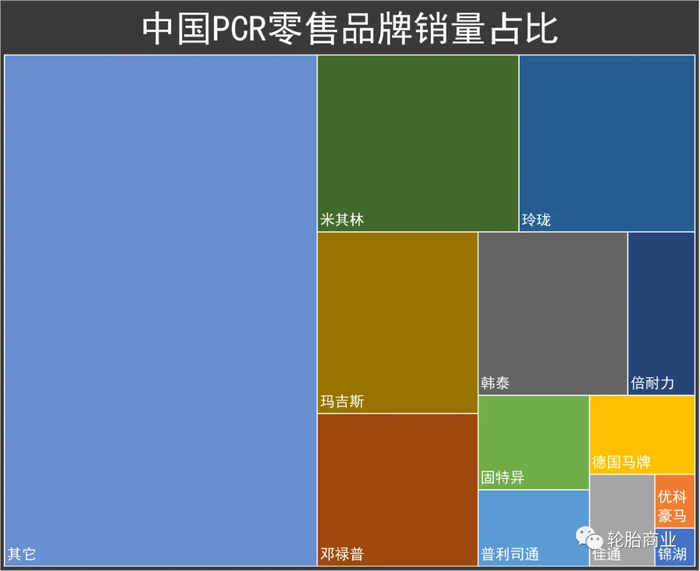 而国内品牌,近年来凭借着技术质量的不断升级、零售渠道的不断扩大,以及在原配市场的持续发力,其在零售终端市场也开始逐步崛起,追上甚至超过了不少海外品牌的市场份额。截至目前,玲珑和玛吉斯两家中国轮胎企业在国内PCR零售市场的销售份额已经占到了约17%。