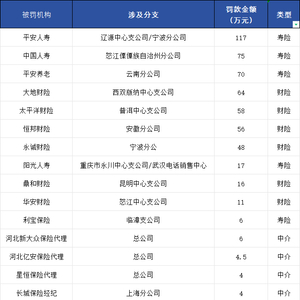 从被处罚的地域看,本周的违法违规行为主要集中在云南、安徽、河北、吉林、上海、重庆、宁波等地;处罚金额多达上百万元,低至万元;从被处罚的公司类型看,中介公司占7家,财险公司6家,寿险公司5家。处罚详情如下表。