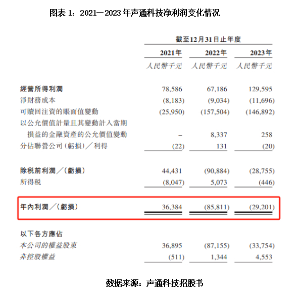 根据招股书,2021—2023年,声通科技的净利润分别为0.37亿元、-0.86亿元、-0.29亿元,其中,2022年,其净利润由盈转亏。