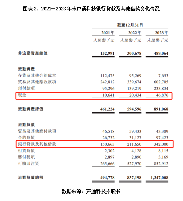 招股书还显示,截至2023年末,声通科技的货币资金仅有4687.6万元,但其流动负债中的银行贷款及其他借款金额却高达3.42亿元。