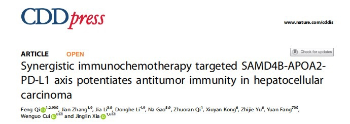 复旦大学附属中山医院肝肿瘤内科夏景林教授团队率先提出肝癌“鸡尾酒疗法”,并于日前就肝癌鸡尾酒疗法抗肝癌及其作用机理,在《细胞死亡与疾病,Cell Death & Disease》杂志上发表了题为“免疫化疗协同靶向SAMD4B-APOA2-PD-L1轴增强肝细胞癌的抗肿瘤免疫(Synergistic immunochemotherapy targeted SAMD4B-APOA2-PD-L1 axis potentiates antitumor immunity in hepatocellular carcinoma)”的研究论文。