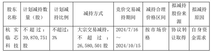 根据减持计划,杭实临芯拟自公告披露之日起15个交易日后的3个月内,通过集中竞价或大宗交易方式减持不超过3987.08万股,即不超过公司总股本的3%。其中,通过大宗交易减持的股份不超过公司股份总数的2%。减持期间为2024年7月16日至2024年10月15日,减持价格将按市场价格确定。