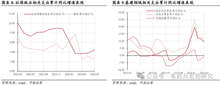 支出结构方面, 5月公共财政向基建领域支出占比实现18.4%,较上月增加0.6个百分点,财政支出继续向 “稳增长”领域倾斜。具体来看,5月公共财政预算向城乡社区、农林水事务及交通运输领域支出的同比增速分别实现0.1% 、9.0%和9.5%;“三大工程”及“大规模设备更新”等核心政策有望成为年内财政支出的重要投向。