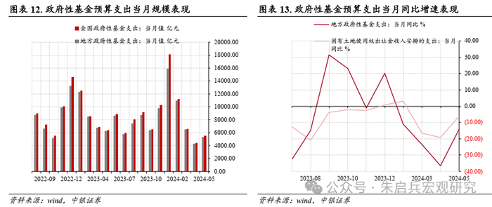 单月数据方面,5月政府性基金支出实现5506.0亿元,同比下降14.2%,降幅较上月明显收窄21.7个百分点;中央政府性基金支出规模为164.0亿元,同比下滑5.7%,增幅较上月下滑26.0个百分点;地方政府性基金预算支出5342.0亿元,同比下滑14.4%,降幅收窄22.1个百分点;国有土地使用权出让收入相关支出2867.0亿元,同比下滑6.1%,降幅收窄13.2个百分点。5月地方政府性基金预算支出明显发力,或主要受超长期特别国债发行加速影响。