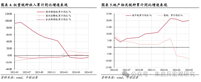 其他权重税种方面,5月为企业所得税征收的季节性高点,企业所得税在当月税收收入中占比实现33.2%,是当期占比最大的税种。但需注意的是,5月企业所得税收入同比下滑10.6%,拖累当月税收同比增速3.7个百分点,关注“扩内需”对企业盈利的保障作用。