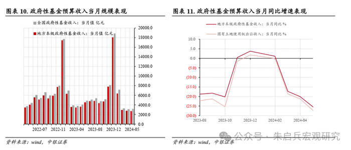 单月数据方面,5月中央政府性基金收入规模3154.0亿元,同比下降22.2%,降幅较上月走扩4.1个百分点。地方政府性基金收入规模2716.0亿元,同比下降25.5%,降幅较上月走扩5.4个百分点,国有土地使用权出让收入2274.0亿元,同比降幅下降至27.4%,降幅较上月走扩6.2个百分点,广义财政收入仍受土地收入弱势制约。