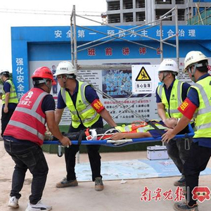 “在项目现场有人从高空坠落,请大家迅速展开救援!”6月24日,某个建筑工地上传来焦急的呼救声。“先展开自救,安排人员封闭现场,禁止其他人员进入;立即拨打120、119……”项目负责人迅速赶赴现场并启动应急救援预案。这不是真正的“意外”,而是一场实地、实战结合的安全救援应急演练。