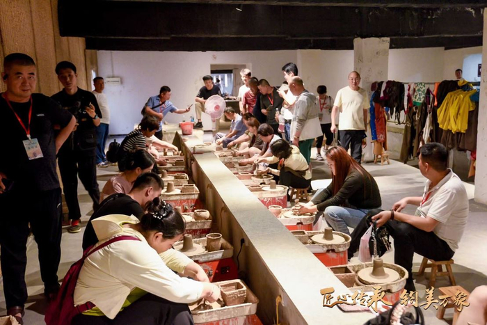 走进千年古镇,探寻钧瓷传承,下午,嘉宾游览神垕古镇,走进明清古街,感受了千年钧瓷古镇的文化底蕴;豫见钧瓷工厂,感受匠人匠心,嘉宾们一同走进钧瓷工厂,观看钧瓷烧制工艺,了解和体验了钧瓷制作流程,体验手拉胚技法,使研有所思,行有所获。